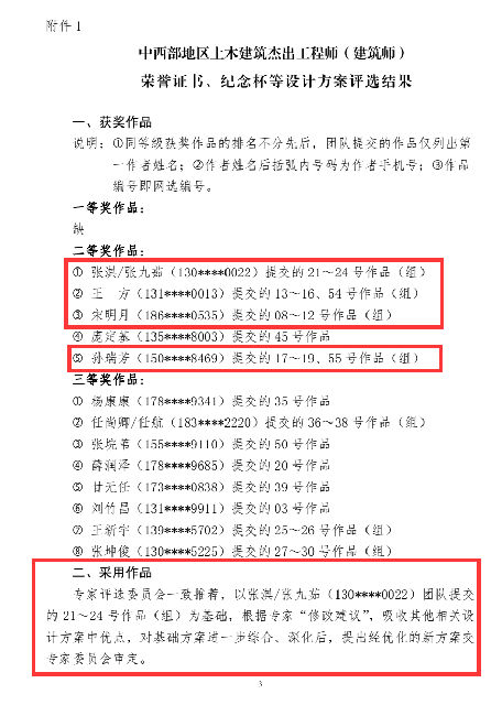我公司环艺所共有四组作品参赛,全部获得二等奖(一等奖空缺);经专家评选委员会一致推荐,将以张淇/张九茹团队提交的 21~24 号作品(组)为基础,根据专家“修改建议”进一步综合、深化后,作为本次设计方案征集最终定稿。