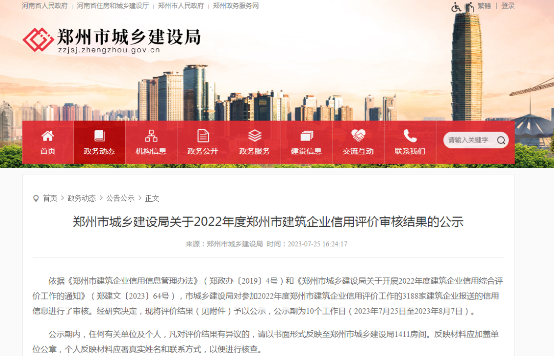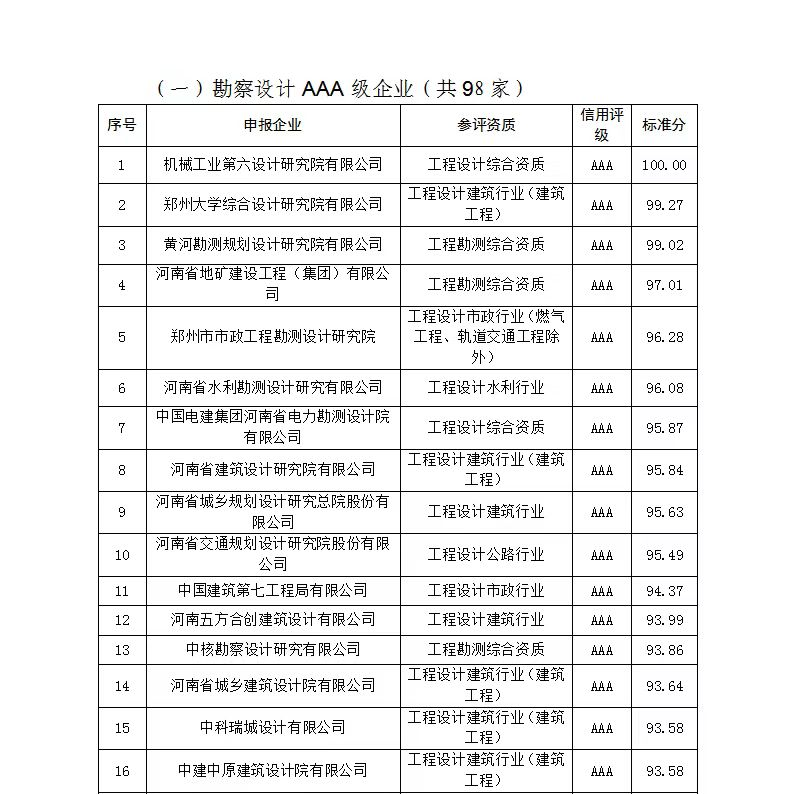 7月25日,郑州市城乡建设局发布2022年度郑州市建筑企业信用评价结果,公司再次荣获郑州市信用评价AAA级企业。值得一提的是,在本次评比中,公司以99.27分取得全市勘察设计行业第二名的好成绩!