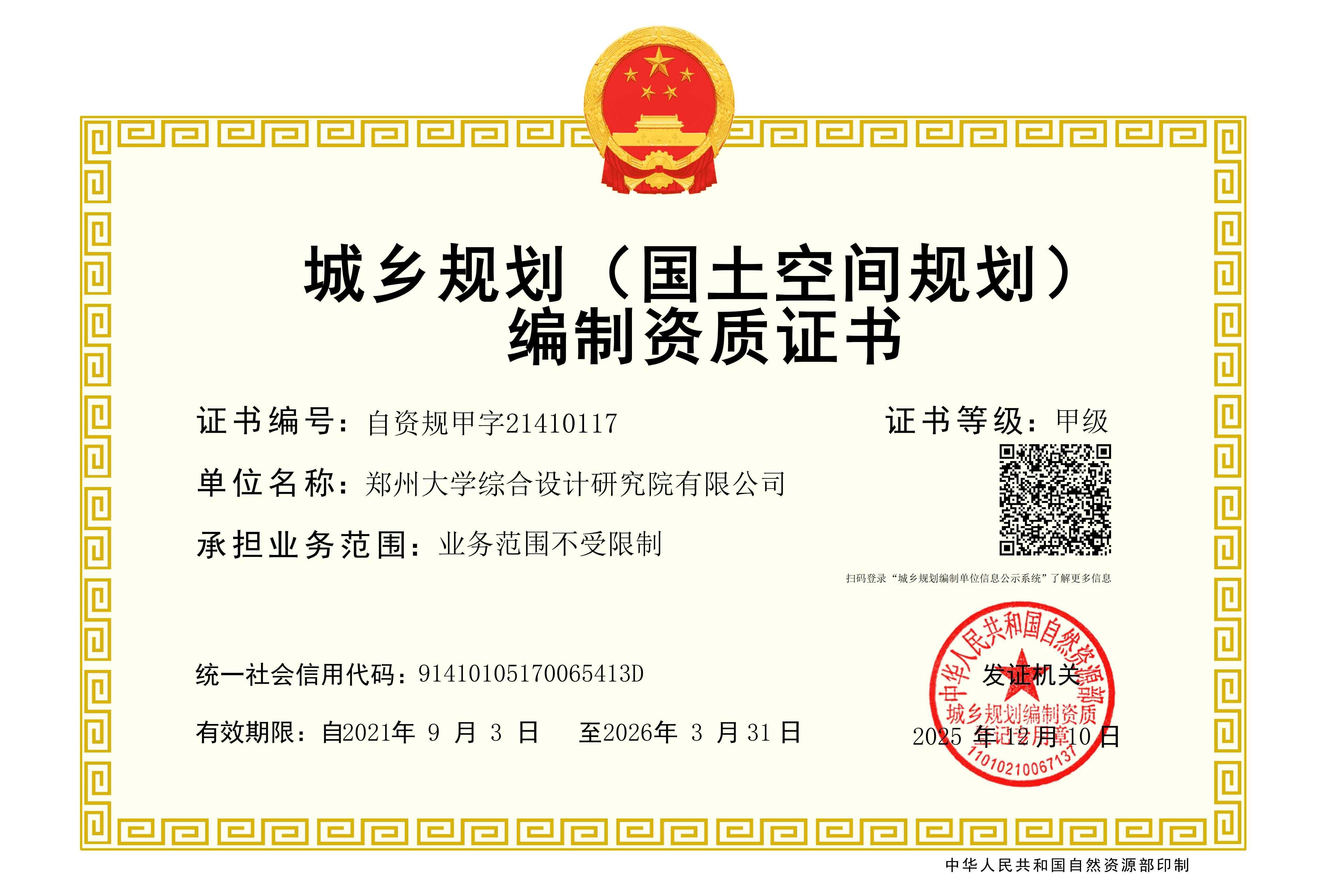 城乡规划(国土空间规划)编制资质证书