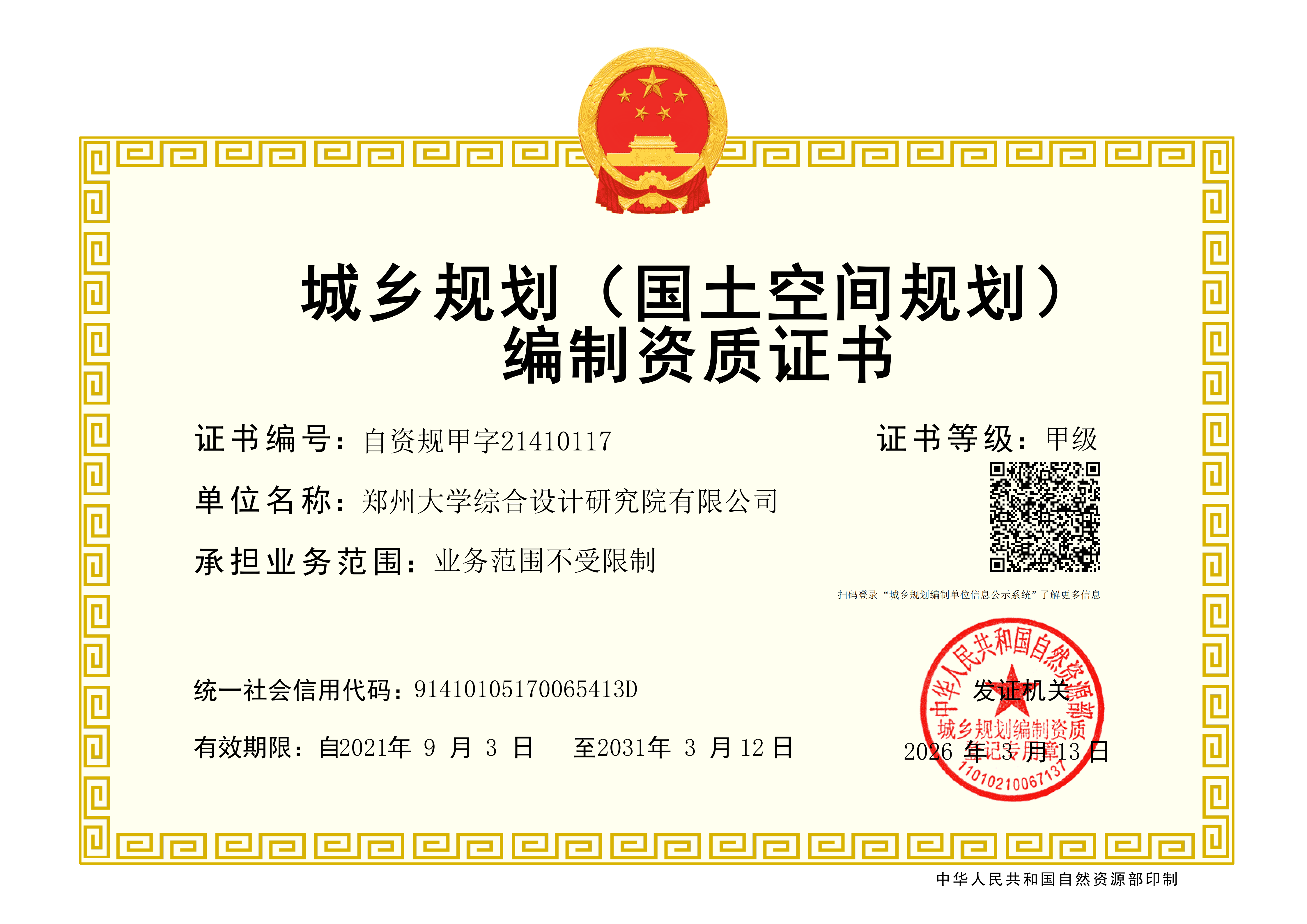 城乡规划(国土空间规划)编制资质证书