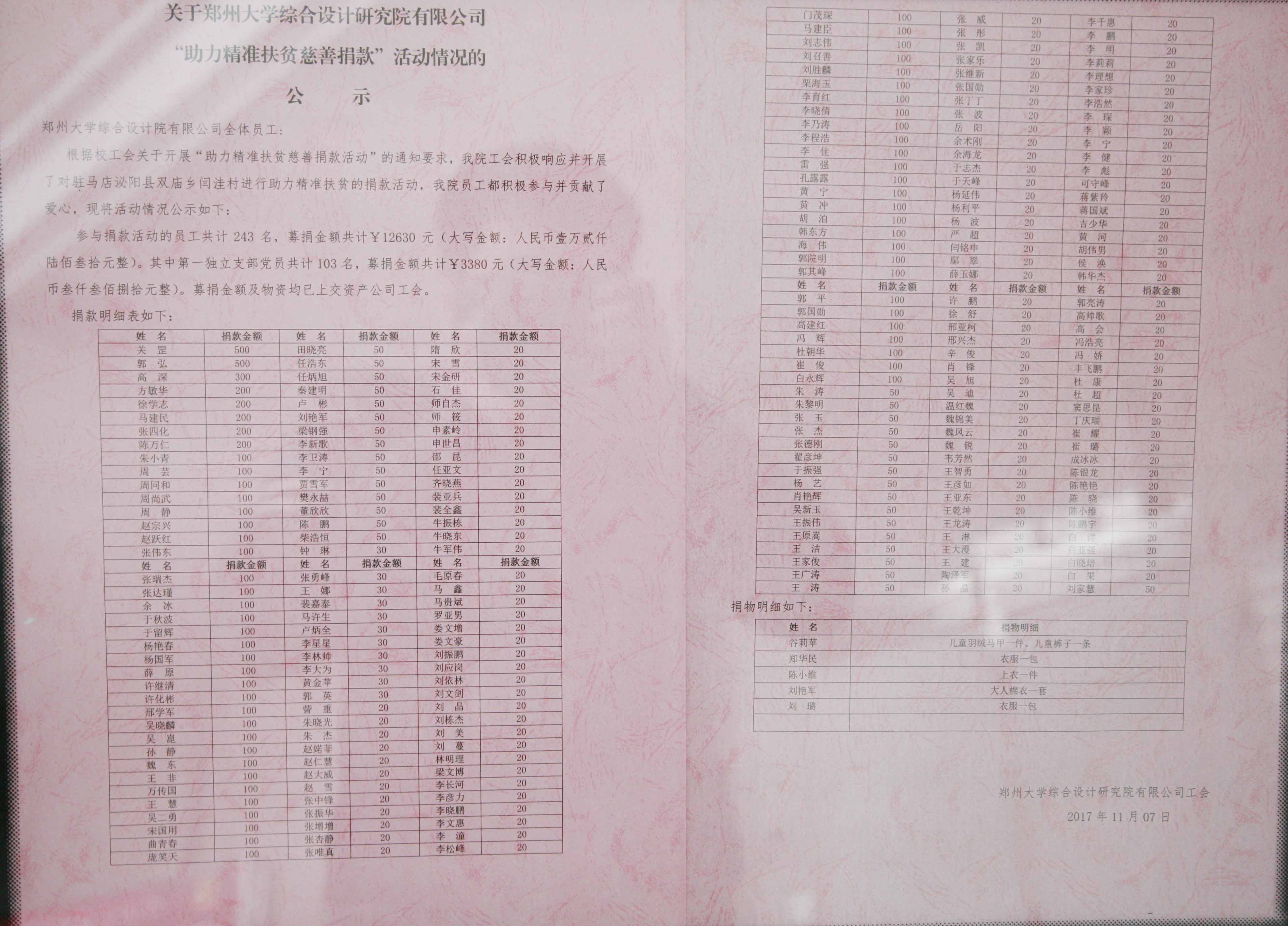 此次全院参与捐款活动的员工共计243名,募捐金额共计¥12630元,募捐金额及物资均已上交资产公司工会。其中第一独立支部发动党员共计103名,募捐金额共计¥3380元。第二分院、第五分院、第一分院、水环所、土建所、能源所工会小组表现积极组织有序。捐款捐物明细已经张贴大厅公示。
