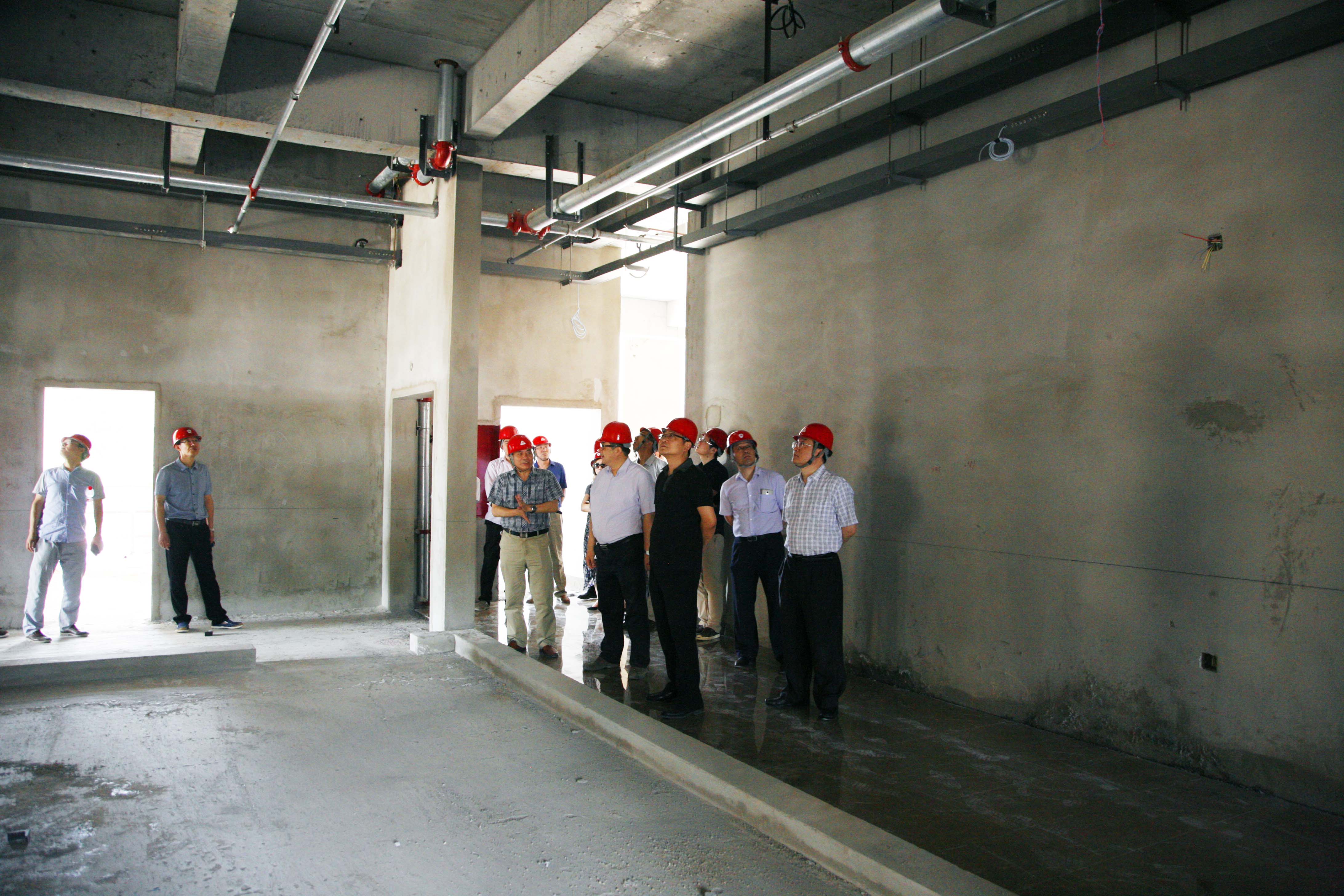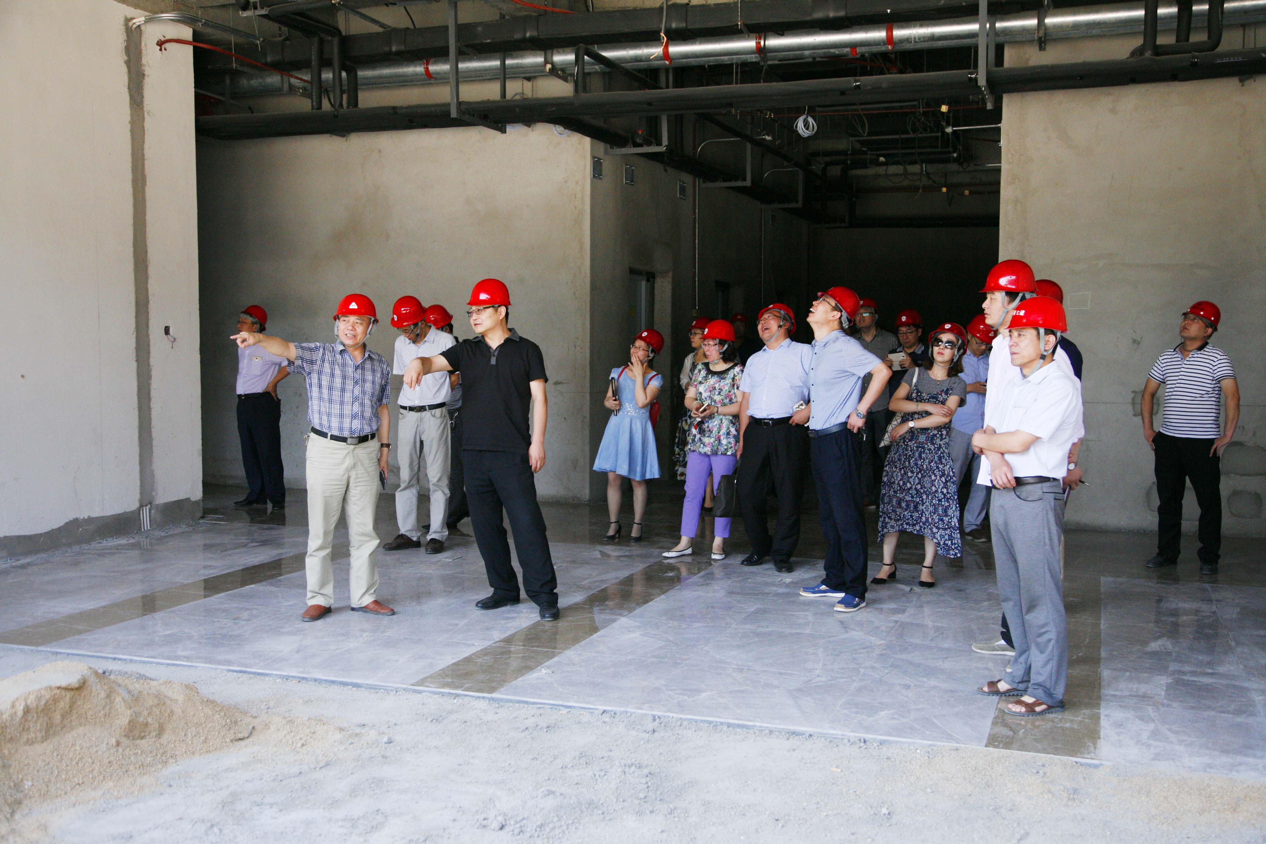 邢学军院长向参加观摩的领导介绍了大楼目前的建设进度和施工情况,带领大家参观了二楼公共区域、卫生间、房间样板间的基础装修,对地板砖的选型、铺装及综合管线的敷设质量向大家征集意见,意见汇总、修改后展开大面积施工,确保大楼于10月份具备基本使用条件。