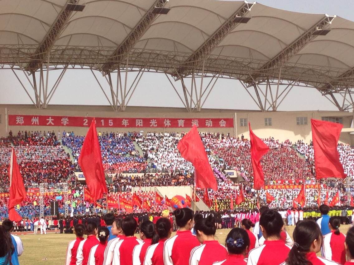 2015年4月16日,郑州大学2015年“阳光体育运动”田径运动会在新校区中心体育场隆重开幕。